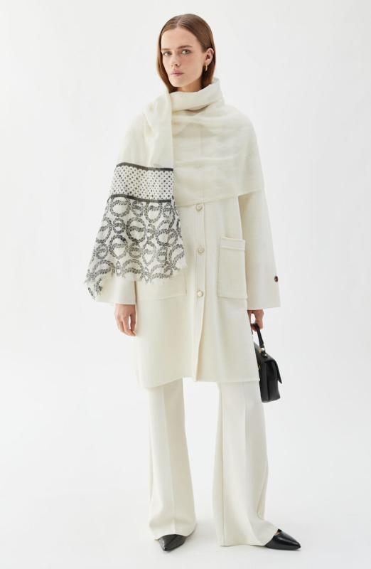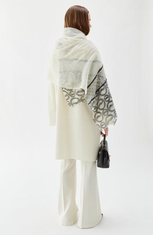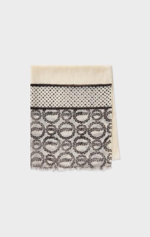 Linnea Printed Scarf is woven scarf made in a lightweight wool quality. The pattern is a beautiful combination of lines, dots and the Busnel rope logo. The print is made by hand, which means that all scarfs are unique with small disparities.