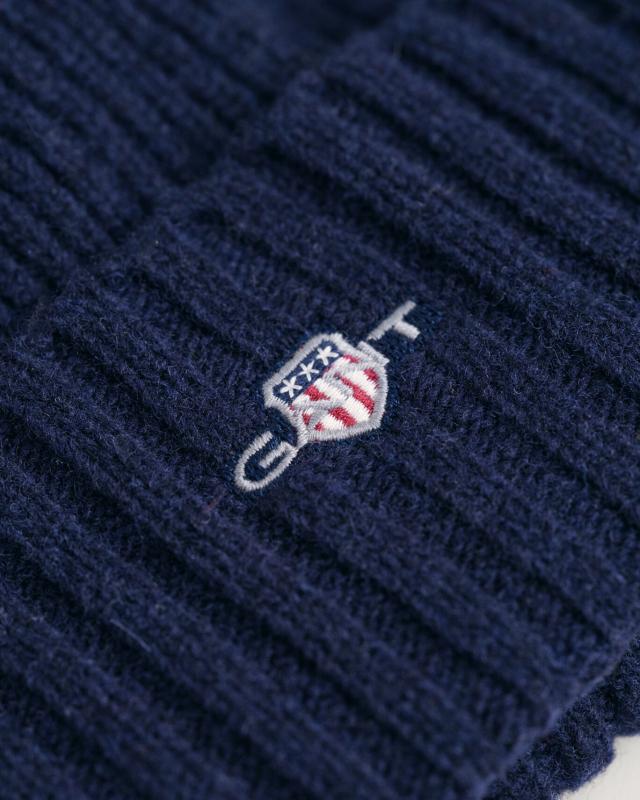 En klassisk ribbstickad mössa som passar till det mesta. Den är gjord i en mjuk och skön ullblandning med en normal passform och en liten sköldlogotyp broderad på mitten av uppvikningen.