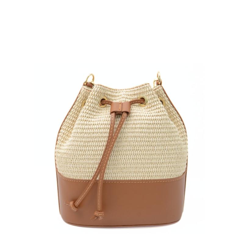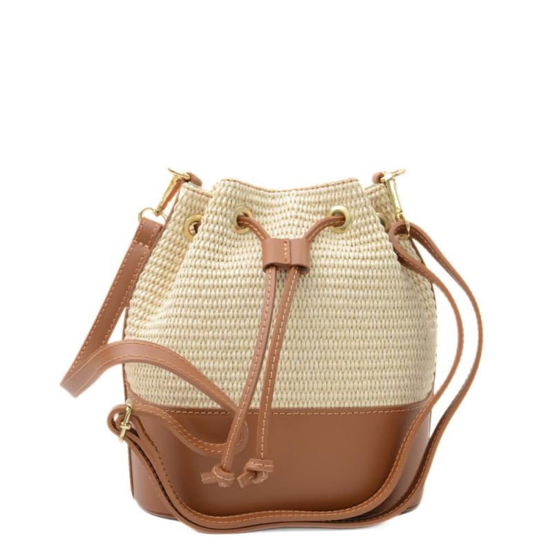 En somrig och lätt bucket bag i flätad raffia – perfekt för varma dagar. Väskan stängs med ett snöre och har ett avtagbart handtag samt en lång axelrem för flexibel användning. Insidan rymmer det viktigaste och har en innerficka med dragkedja samt två öppna fack för enkel organisering. En stilren och praktisk accessoar för sommarsäsongen.
