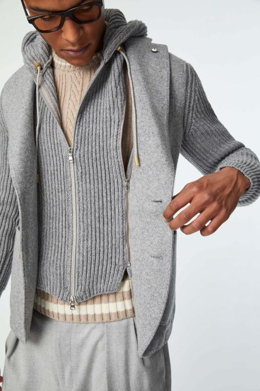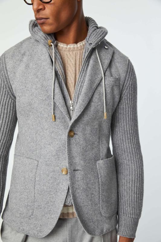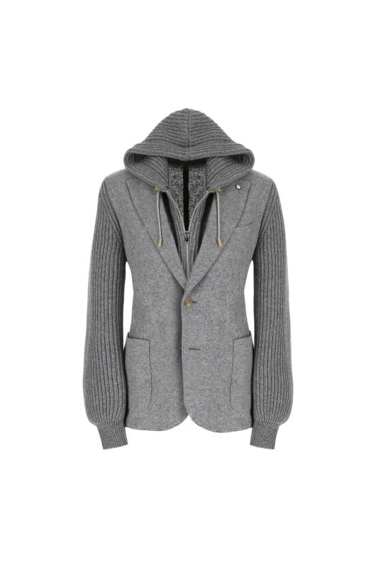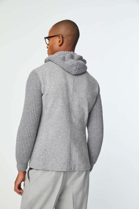 Crafted from a light gray melange jersey, this versatile single-breasted blazer features a wide-ribbed, detachable hood for added functionality. Wide-ribbed sleeves add a unique touch, making it the perfect winter blazer.