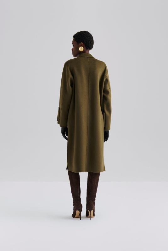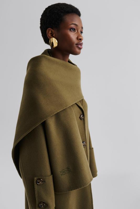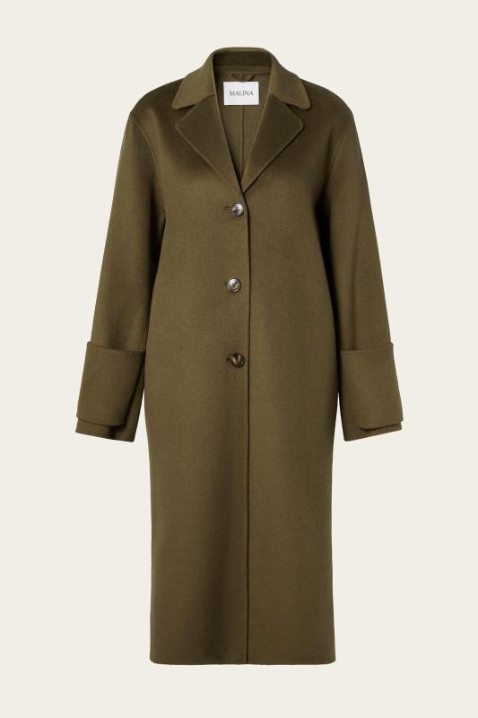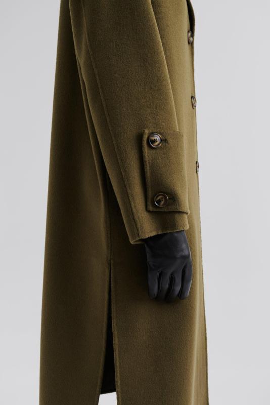Lång kappa i ullblandning med djup knäppning, slag och manschettdetaljer.