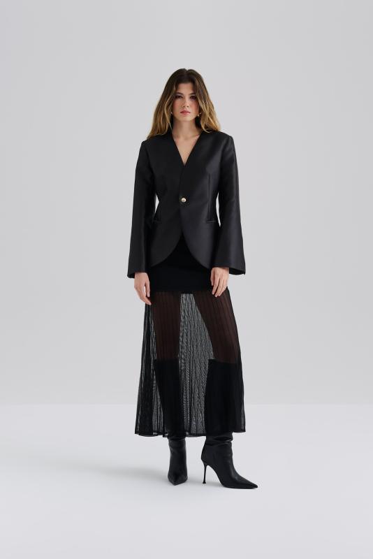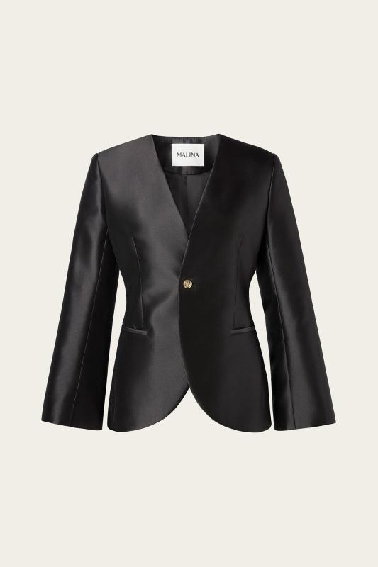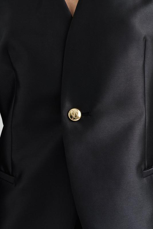 Figursydd blazer i kraftig satin med en guldfärgad monogramknapp.