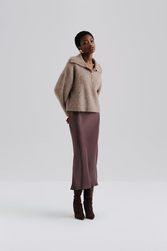 Tröja i en alpackablandning med nedvikt krage och guldknappar med Malina-monogram.